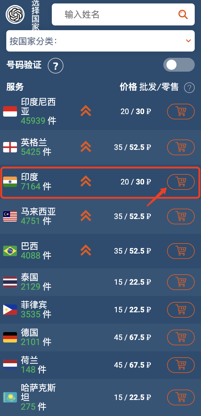 点击 OpenAI,选择购买某个国家的临时手机号。一般首选印度,不过目前很多人反馈印度收不到验证码,我最后买的是印尼的,和印度价格一样,可以收到验证码。